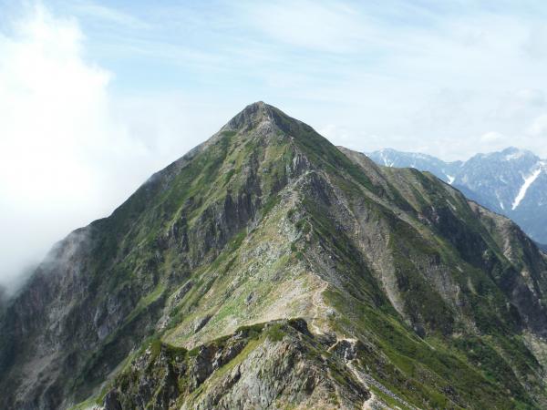 剱が見守る中、近づくにつれ形が大きく変わっていく鹿島槍の変化を楽しみながら登りました。そしてついに、去年お預けとなっていた北峰に立ちました!静かな感動がじわじわと込み上げてきます。振り返ると、ここまでの縦走路が後立山の特徴的な地形、東側が切れ落ちた非対称山稜であることがはっきりわかります。サインペンですらすらっと書いたような、流線形のきれいな稜線が眼下に描かれていました。