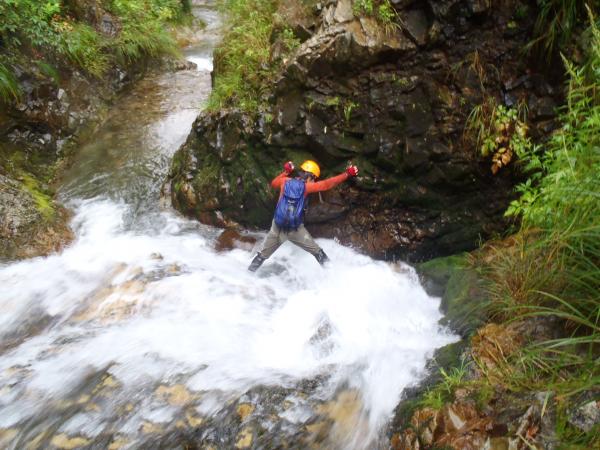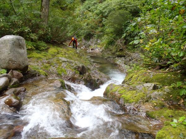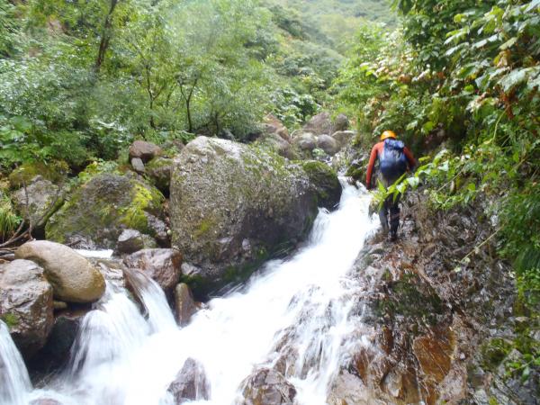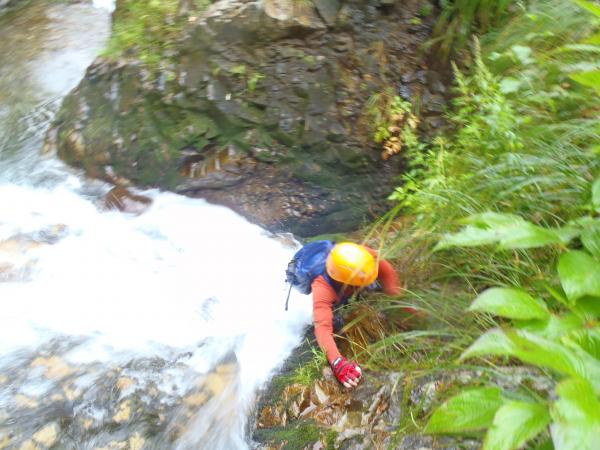 水温は冷たく水に積極的には浸かりたくないのでヘつりを多用した、上部は小滝がコンスタントに現れ