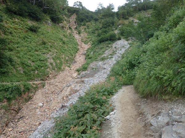 歩きやすい登山道。ガラ場横断時は上からの落石に注意。