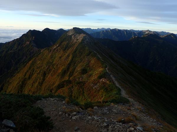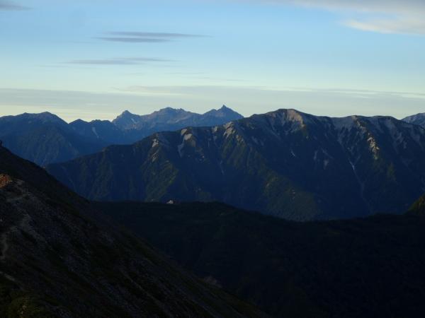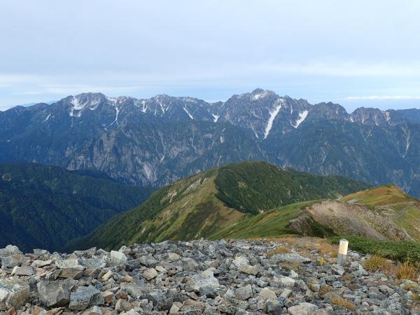 鹿島槍ヶ岳の辺りから晴れてきて、剣岳や立山三山、槍ヶ岳、鷲羽岳、水晶岳など北アルプスの名峰がぐるりと見渡せ、最高の眺めでした。
