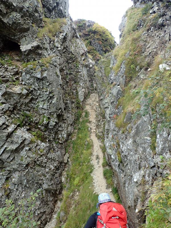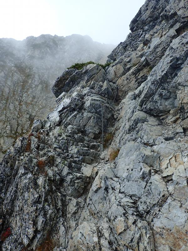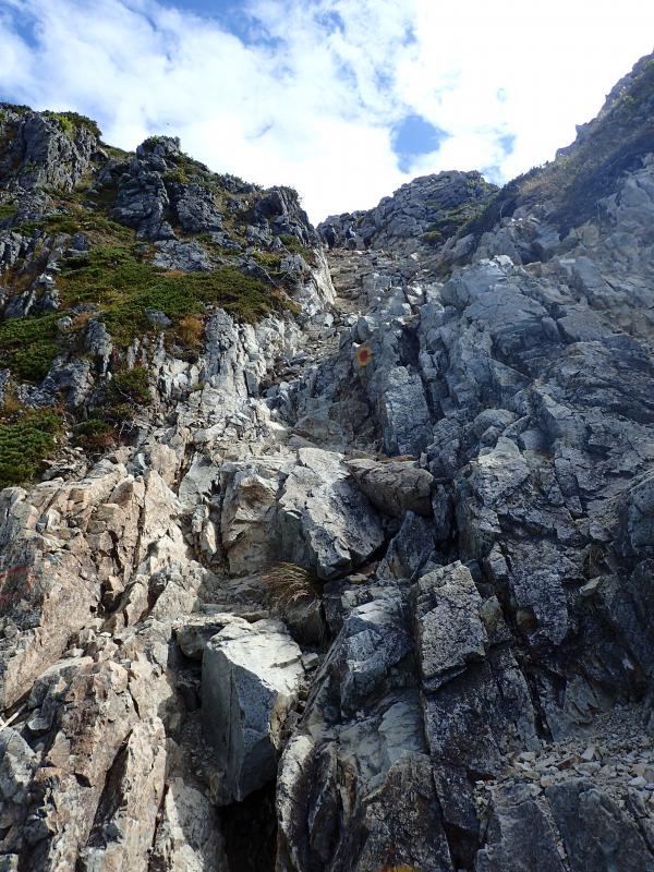 切れ落ちたガレ、急傾斜のザレ、梯子、鎖場、鎖のない岩場など難所の連続。