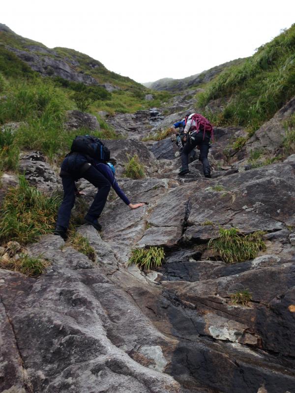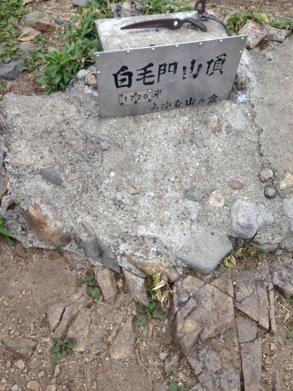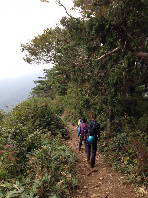 詰めは、ジジ岩を左手に草付きの岩場を上がっていきます。高度感が結構あります。残念ながら、白毛門山頂はガスがかかって何も見えず。下山は登山道を行きます。