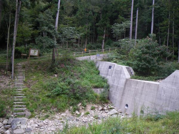 途中にベンチあり、森の解説看板あり。