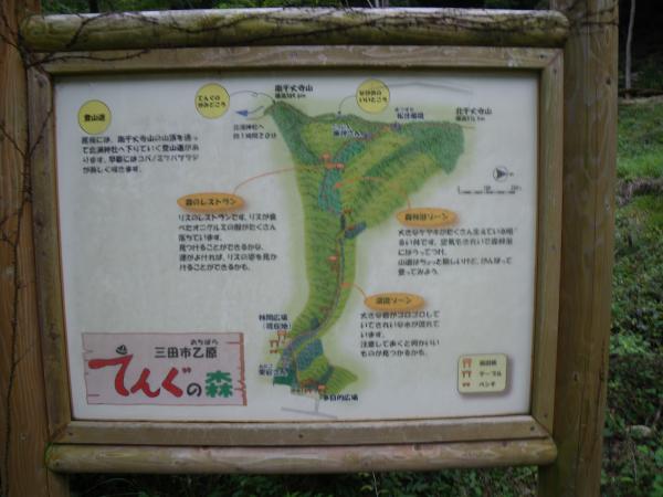- てんぐの森→(3分)→登山口→(30分)→祠の広場→(10分)→山頂→(10分)→祠の広場→(25分)→登山口→(3分)→てんぐの森