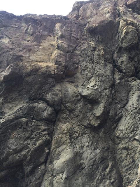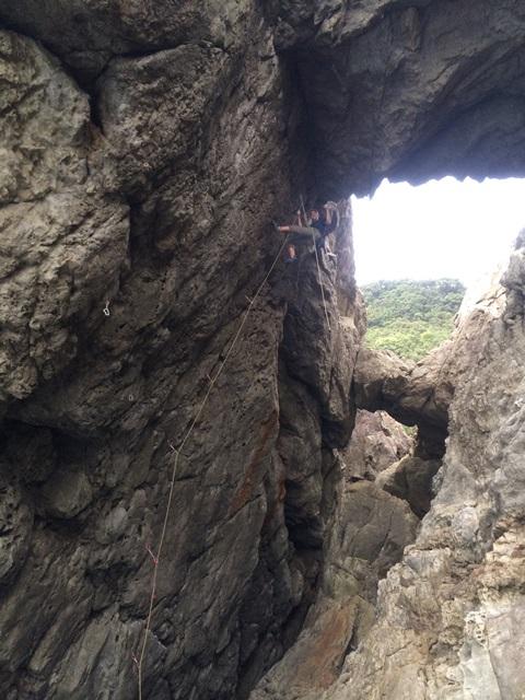 休憩所からは林道から外れて岩場までトラバース。崖が切れ落ちており、所どこにロープが張ってあります。展望が開けたところから海に向かって左手側に下って行くと、朽ちかけたロープが岩の裂け目から覗いており、そこがケイブの入り口になります。
