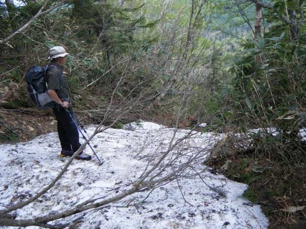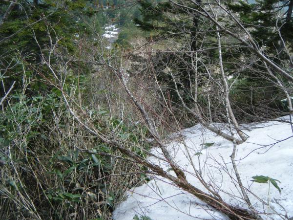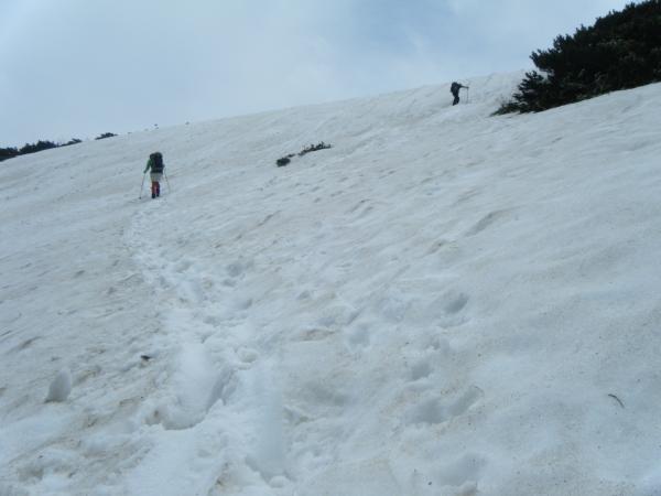 - 序盤、終盤の登山道は沢の様相でその上に雪が残っている状態。踏み抜くと濡れるし体力の消耗が激しい。