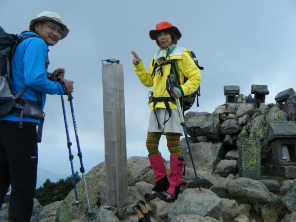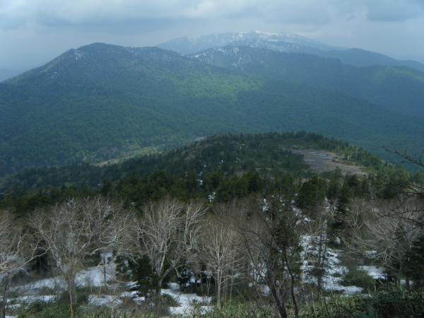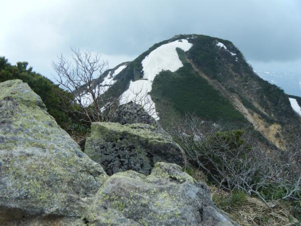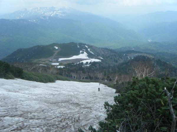頂上は雪もなく双耳峰の柴安嵓が良く見えます。僅かな時間で縦走できるのですが、今回は手前の雪稜が腐っていて下りが危なそうなので途中で止めました。小屋の親父さんによると結構滑って落ちる人が多いようです。下はブッシュなので死なないようですが。