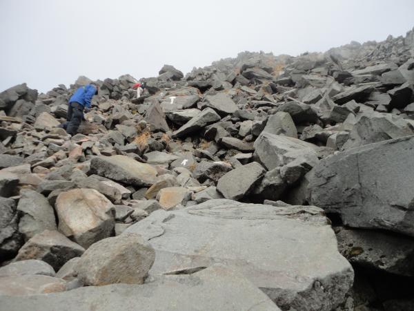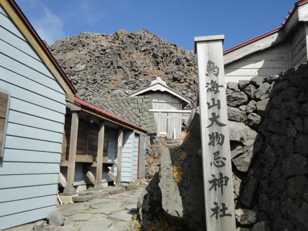 しかし登ってみると、下から見えたゆるやかなカーブは山頂ではなく、その奥にゴリゴリとした本物の山頂が…えぐれた釜の底のような場所にある神社まで下り、腹ごしらえをして山頂を目指します。