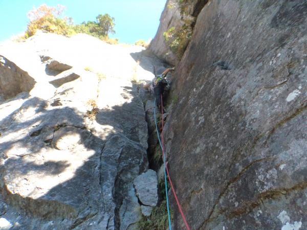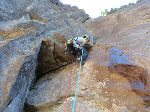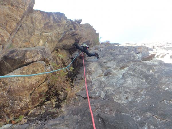 1ピッチ目はボロボロでうすかぶり気味の凹角を登ります。ここがとても悪い。