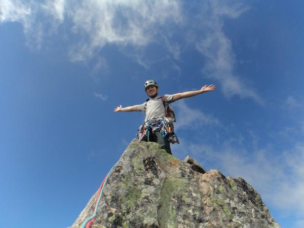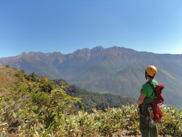 「見張り塔からずっと」は山頂まで行ける長いルートです。下部は支点がとりにくく、ナッツやハーケンを多用しました。上部は核心が2ピッチ続き、ここがこのルートで一番楽しい部分。支点は取りやすいので快適に登れます。山頂からは明瞭な道と赤テープが付いているので、登攀の余韻に浸りながら下山できます。