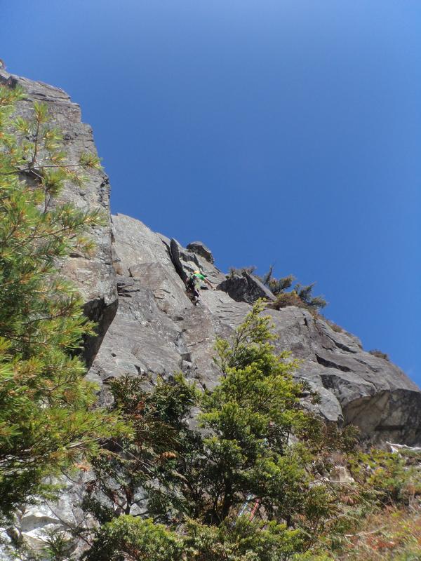 「烏帽子岩」の下部では岩がもろくかなり気を遣いました。上部に行くにつれ硬くなりますが、上部はラインが分かりにくいです。3ピッチで頂上まで行ける良いルートでした。