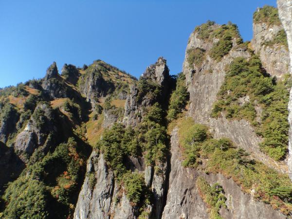 入山=槍見温泉(6:00)~錫杖沢出会い(7:00)~錫杖前衛フェース取付き(7:40)~「注文の多い料理店」開始(8:10)~終了(10:20)~烏帽子岩取付き(11:20)~「東肩ルート」開始(11:40)~終了(12:30)~懸垂終了(13:20)~「左方カンテ」終了点(14:20)~懸垂終了(14:50)~錫杖岩小屋(15:50)