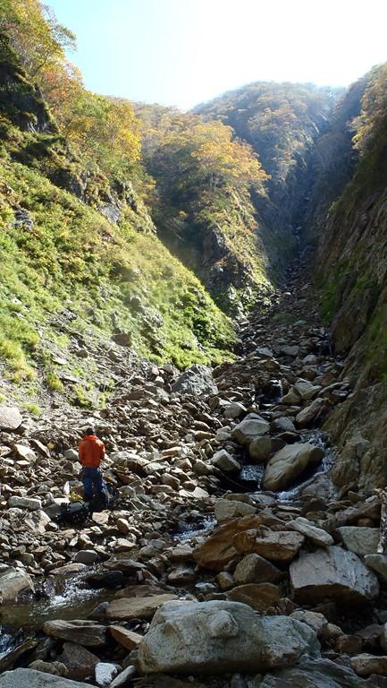 北面直登沢の下降はやはり一筋縄では行かず、680m二股までは難しいクライムダウンや懸垂下降の連続で息つく暇もないという感じでした。最後は再び長い長い河原歩きと林道歩きに苦しめられましたが、天気にも恵まれ素晴らしい秋の沢旅を堪能することができました。パートナーの枝中さんには感謝の一言。また来年、日高の沢に入りましょうと約束して帰宅しました。