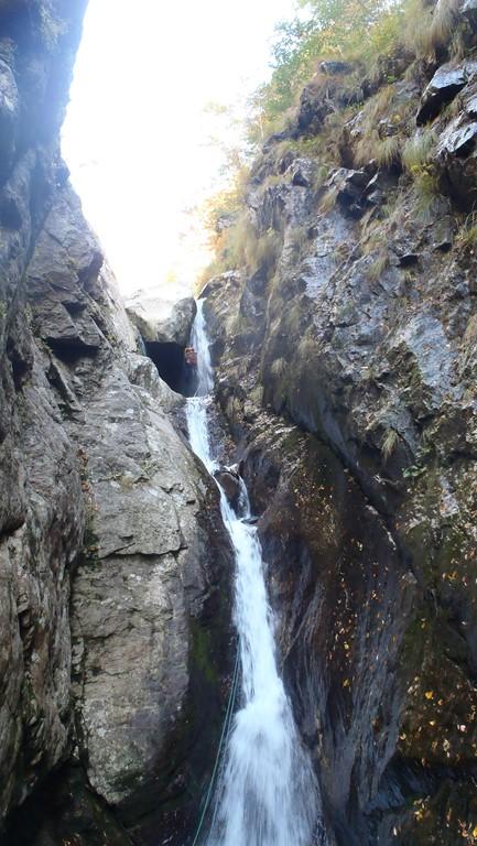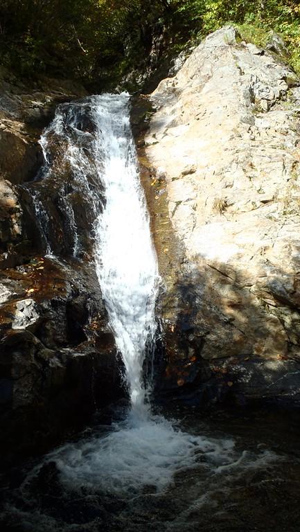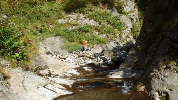 今回の沢旅でソエマツ岳南西面沢とならんでメインと考えていた沢です。上部は急峻なガレが続きますので落石に要注意です。1200m付近から大滝が出てきます。谷は深く迫力ある渓相は見事です。巻きも急な側壁をきわどく縫うような感じで、クライムダウンも緊張します。懸垂下降は5,6回したと思います。800m付近のCSの滝の懸垂下降は強烈な瀑水を浴びてさらに滝壺に飛び込みとキビシイです。680mから下流はゴーロとなります。核心部は短いですが、やはり日高の難渓、手応えは十分です。グレードは4級でしょうか。