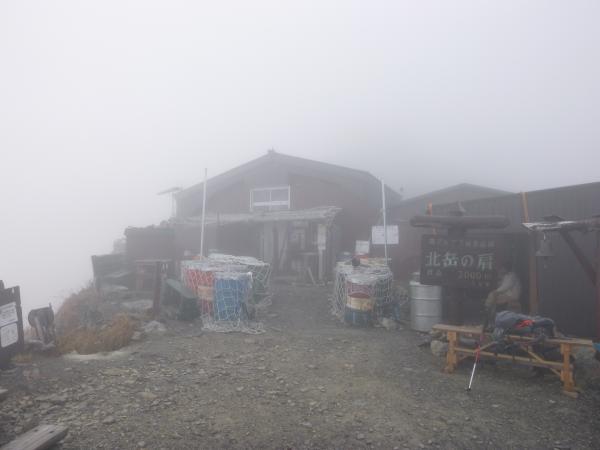 稜線はガスっていて風がとても強く寒かったです。肩の小屋前で雨具として持っていった