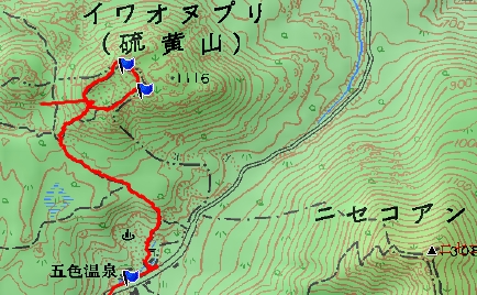 - 五色温泉登山口→10分→入山ポスト→30分→イワオヌプリ分岐→40分→イワオヌプリ山頂→30分→イワオヌプリ分岐→20分→入山ポスト→10分→五色温泉登山口