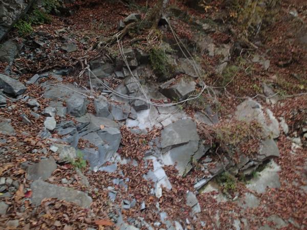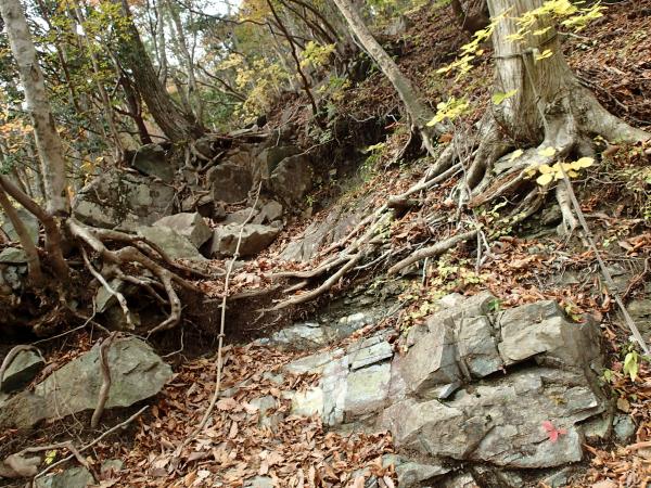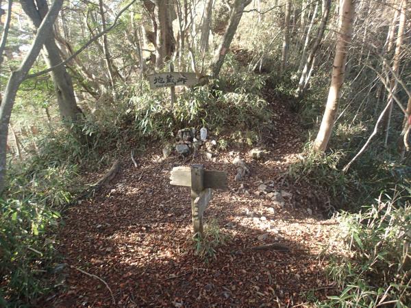 帰路は地蔵峠経由。やや急なところもあるが、登りに使った尾根道よりも歩きやすい。地蔵峠には第一と第二があり、下部温泉へ下りる道は毛無山寄り北側の第二地蔵峠から。第一地蔵峠から山梨側へ下ろうと試みるも、20歩程で道が埋もれてなくなってしまった。