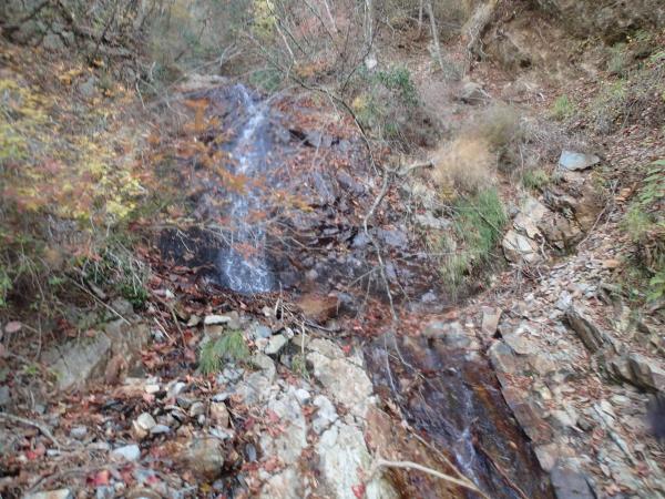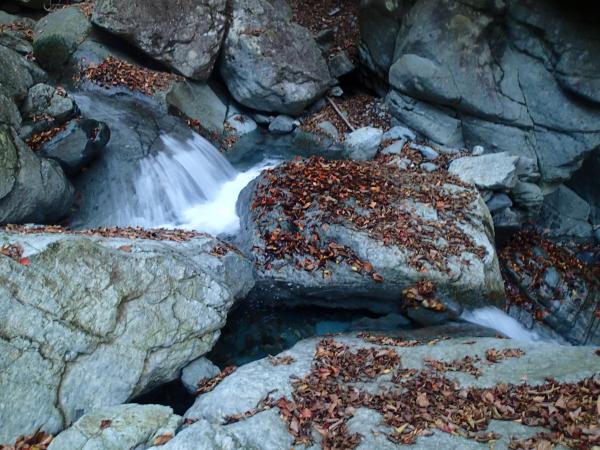 第一地蔵峠から静岡側へ、金山沢沿いに下る。15分程下ると水場となる小滝に出合う。すぐ上を登山道が横切ってはいるが、水はキレイそうであった。2か所程イヤラシイ岩場(ロープ付)もあったが、登りに使った尾根道よりむしろ歩きやすかったかと思う。ただ、下流が近くなってくると、沢を橋無しで右へ左へ何度も渡る場面があり、天候次第では歩けなくなってしまいそうであった。