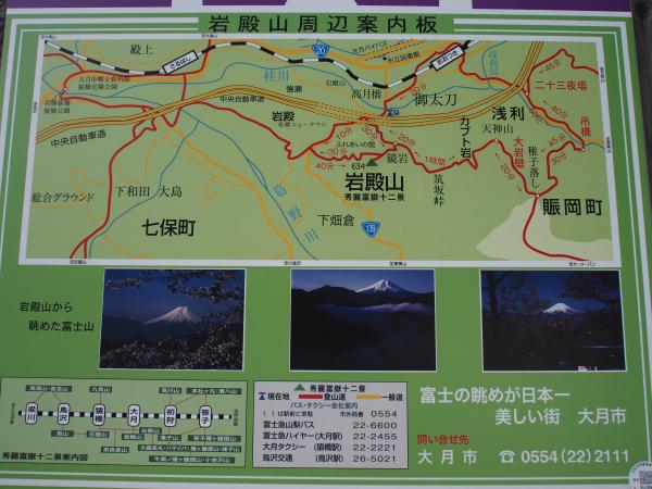 - 駐車場(1分)岩殿山登山口(30分)稚児落し分岐(60分)カブト岩(20分)稚児落し(30分)登山口(40分)大月駅(10分)駐車場
