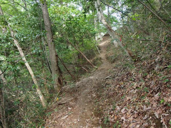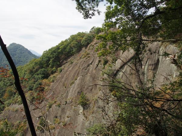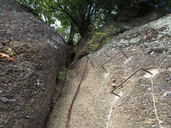 山頂で休憩して、来た道を少し下りて稚児落としの分岐へと向かいます。ここからは道が細くなったり鎖場が出てくるので注意が必要です。特に岩場はスリルいっぱい。