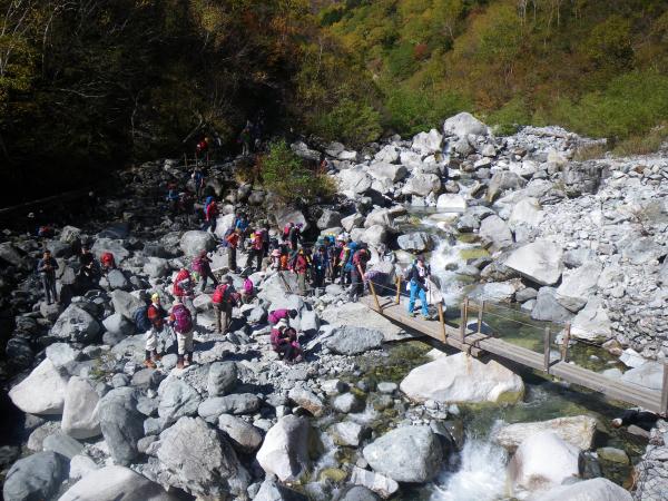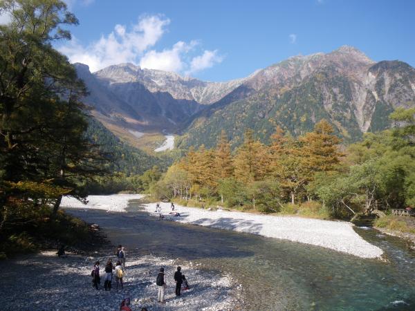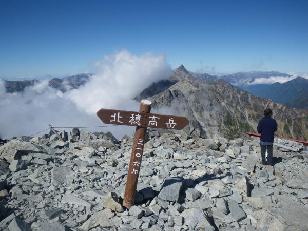 - 1日目:河童橋→(60分)→徳沢園→(40分)→横尾山荘→(40分)→本谷橋→(60分)→涸沢ヒュッテ→(115分)→北穂分岐→(15分)→北穂高岳→(30秒)→北穂高小屋(小屋泊)