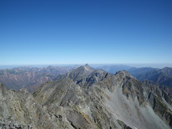 北穂~奥穂へ縦走路は、鎖場あり、はしごあり、岩場歩きで緊張の連続ですが、景色を楽しむ気持ちも必要だと思います。