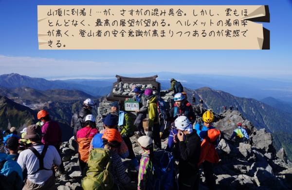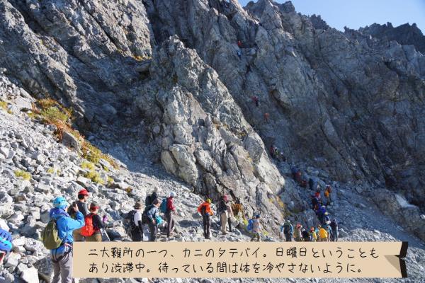 今回は土日ということもあり、カニのタテバイ、ヨコバイでは渋滞がありました。前の週では2時間待ちという話を聞いていましたが、今回はそこまで待つ必要はなかったのが救いでした。山頂では、人が多すぎてあまりのんびりできませんでしたが、抜群の景色を望めました。