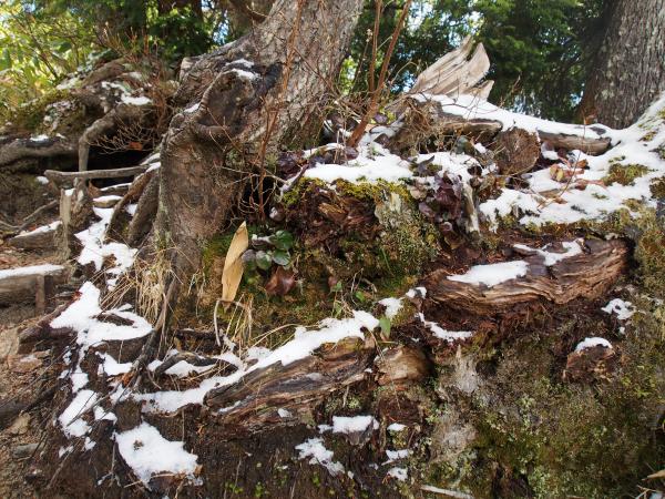 合戦小屋付近から日陰に雪がありました。前日の夜からパラパラと降り始めたようです。