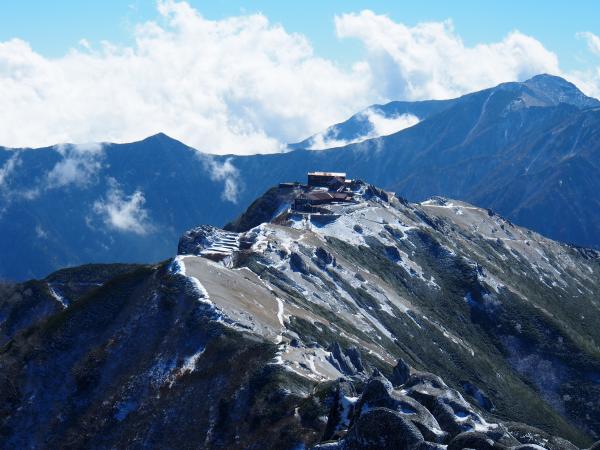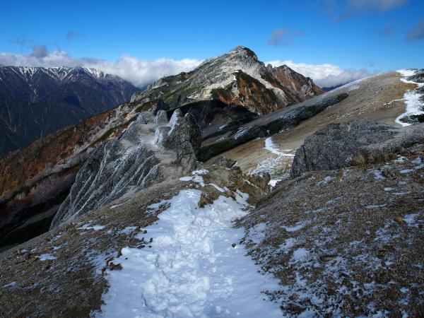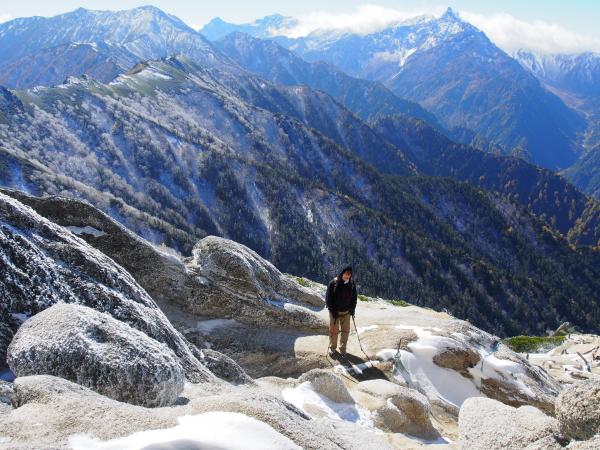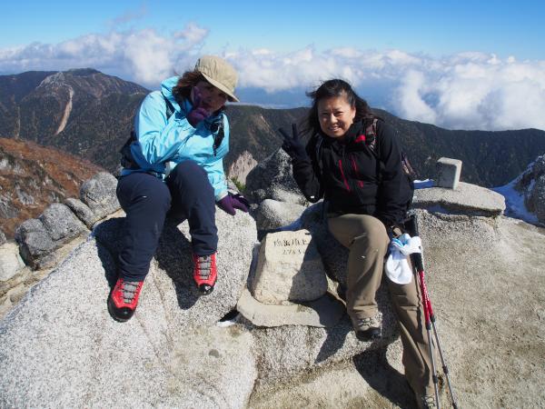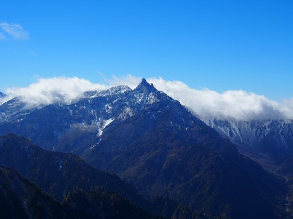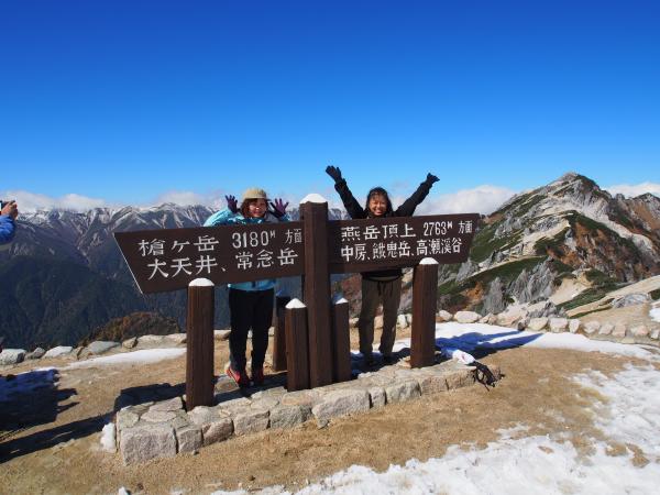 快晴で槍ヶ岳が綺麗に見えました。展望は最高でしたが、山頂付近の気温は2度。手袋がないと寒くてカメラも握れません。
