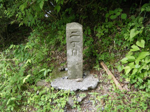 登山道は少し沢に沿ったあと高度を上げていきます。表参道コースは下りが一切無く登りが延々と続きます。走れません。丁目石が置いてあって頂上が51番目です。間隔が短いのでサクサクと登れます。