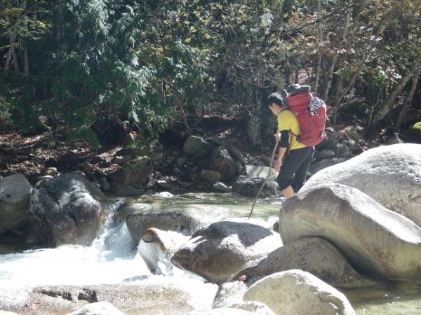 はじめてのアプローチは、父・兄・サイコロのあたりから下流を注視しながらしゃくなげ遊歩道を西脇沢沿いに下ると林の中に岩が川沿いに見え、渡渉点も踏み跡から素直に見つかります。