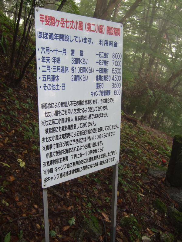 甲斐駒ケ岳方面へと入ると七丈小屋の案内が出てきます。七丈小屋テント場でテント泊の予定です。