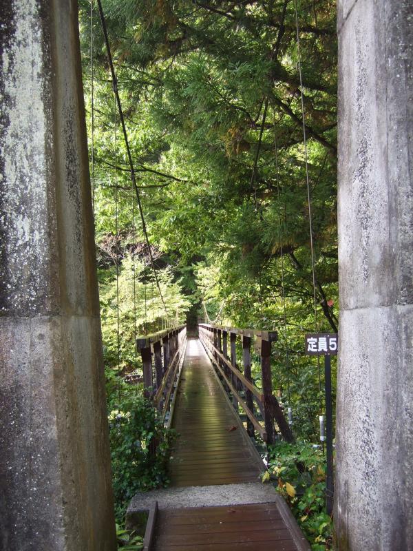 1日目 朝、麓の駒ケ岳神社を出発。尾白川にかかる橋を渡り登山道へと入っていきます。