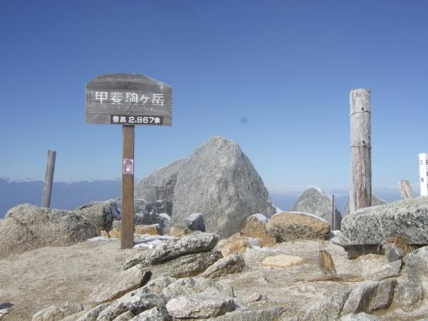 だんだん風が止み、天気も良く、南アルプスの眺めも良い中、山頂が見えてきました。幾つかの岩場や鎖場を通過し、甲斐駒ケ岳山頂到着。