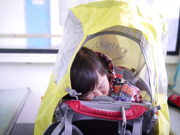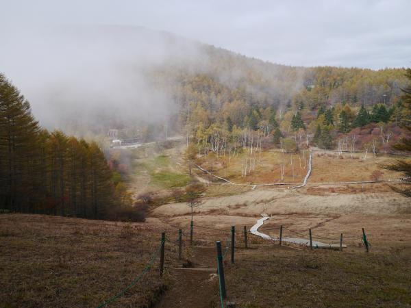 紅葉があって、家族で気軽に登れる入笠山へ行ってきました! 紅葉は駐車場近辺が赤くなっており、入笠湿原から上はカラマツなどが黄葉していました。 駐車場は晴れていましたが、ゴンドラに乗って上がるにつれガスが出てきました。 入笠湿原までは比較的安全な道が続くので2歳の娘には歩いてもらおうと試みましたが、ダッコアピールをされてしまい、ベビーキャリーに乗るのも嫌がりましたが、ダッコのまま登山道を歩くのは危険なので、強引にベビーキャリーに乗せちゃいました。・・・すぐにおとなしくなってくれました。。。 入笠湿原は夏の景色とは一変、茶色い世界です。でも開放的で気持ち良い! 入笠湿原からマナスル山荘までは歩きやすい遊歩道です。そこからは本格的な登山道となります。しかも急坂で、ベビーキャリーの重みがずっしりとのしかかります。 整備はされていますが、岩のごつごつしたところもあるので、しっかりとした靴が必要です。 途中、岩場コースと迂回コースとの分岐が出てきましたが迷わず迂回コースを行きます! ベビーキャリー背負ってますから無理は禁物です。 最後の急坂を登りきると。。。やったぁ!山頂です。 しかも。。。なんとか周りの景色が見える!振り返ると、、、なんと富士山が見えるではないですか! ほとんどあきらめていただけに感動もひとしお! (富士山は見えましたが、八ヶ岳やアルプスは見えませんでした。) 山頂は風が強く、体が冷えていくので、写真を撮ったらすぐに下山開始。 ここからは大阿原湿原へ向かいます。 入笠登山口まで下りきると舗装された林道に出ます。そこから林道を歩くと大阿原湿原に到着です。 風が強く、寒いので駐車場の脇にツエルトを張らせてもらい、昼食を摂りました。 サーモス「山専ボトル」に入れてきた熱々のスープも飲んで、体を温めます。 ホットした後は、湿原を少しだけ見て、入笠湿原方面へ歩きます。 林道は比較的安全なため娘にも歩いてもらいます。(車が時々通りますので注意が必要です) 歩きだしてしばらくすると雨が降ってきました! 娘にはキャリアに乗ってもらいますがやっぱり嫌がります。何とか乗ってもらい、ここで初めてベビーキャリーにレインカバーを使用しました。 心地よいキャリアの揺れと疲れで娘は寝てしまいました。 少し急ぎ気味で、頑張ってゴンドラ山頂駅へ到着! ゴンドラ乗る際にスタッフよりあたたかいおしぼりを渡されました! 冷えた手に染み入るおしぼりの感触がとてもありがたかったです。 あっという間に山麓駅へ。 ベビーキャリーは嫌がりましたが、登山にはついてきてくれる娘に感謝です。 晴れている絶景を見せてあげたい。。。 今度は雲一つない天気の時に来たいなぁと、思いながら帰路に着きました。