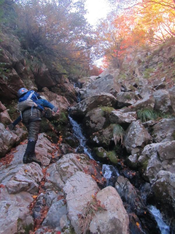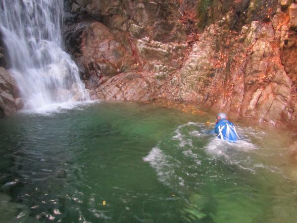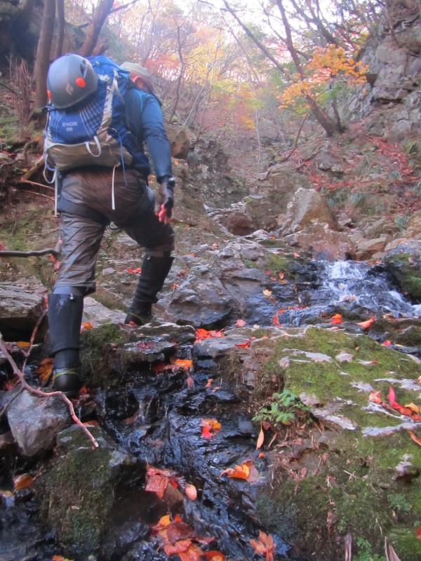 さすがに10月末の水温の低い沢を辿ると、汗ばむ夏の陽射しと蝉の鳴き声が懐かしくなりますが、この蛇谷は廊下帯があるとはいえ大変な泳ぎやへつりがあるわけではないので、紅葉の時期の遡行にも適しています。