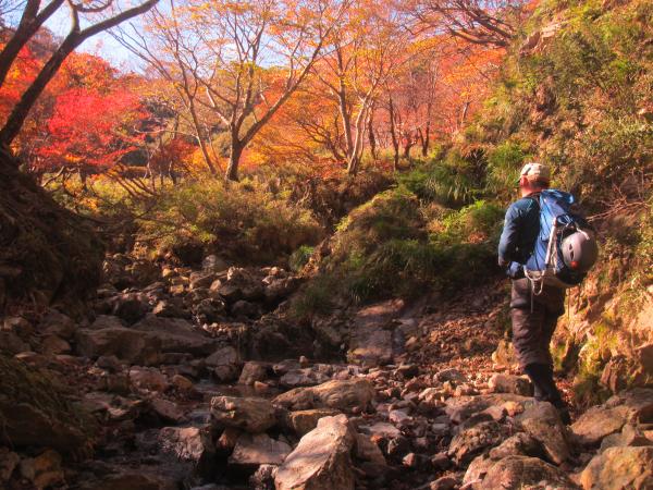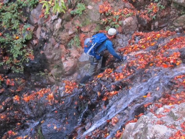 今回は、後者の「蛇谷」で紅葉と清流を愛でながら、水温は低いものの気分爽快な沢登りを楽しんできました。