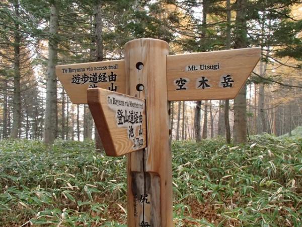 - 林道終点登山口~50分~新池山小屋分岐~120分~空木平分岐~50分~空木岳頂上~40分~空木平分岐~130分~林道終点登山口