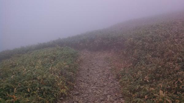 完全にガスっており視界ゼロ、登ろうか下りようか・・・