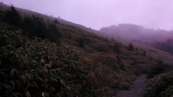 woolのアンダーにウインドストッパーのフリースでちょっと寒い位。多少汗を感じだす頃、天候と違って穏やかな稜線が出てきた。普通なら歓喜するシーンも生憎の天候に盛り上がらない。