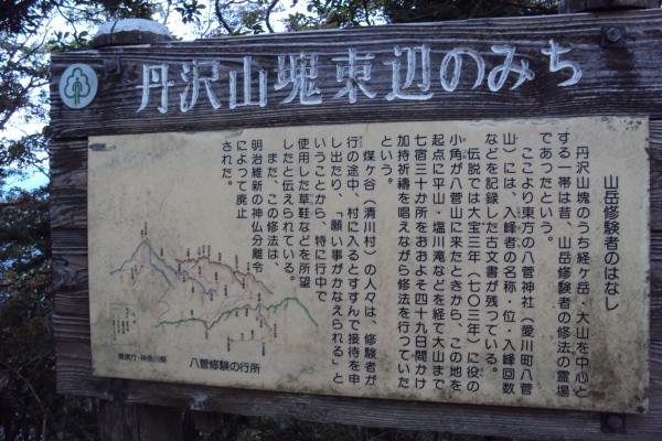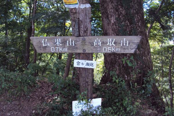 - 大棚沢広場駐車場⇒71分⇒宮ヶ瀬越⇒23分⇒高取山⇒36分⇒仏果山⇒94分⇒土山峠⇒30分⇒大棚沢広場駐車場