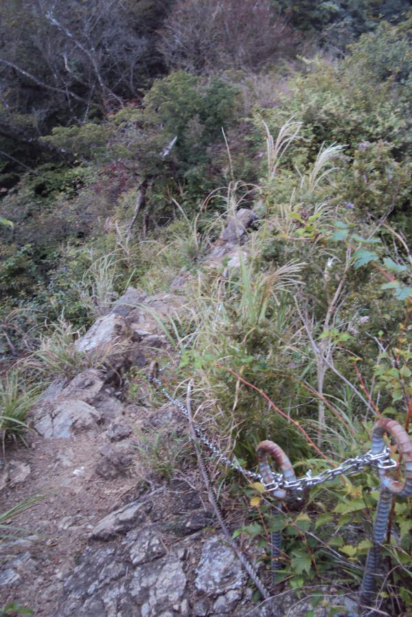 仏果山からすぐの下山の道が、思いのほか岩が多く、鎖も出現してきます。コース中の一番の要注意ポイントとなりそうですので、十分お気を付け下さい。
