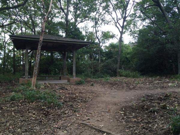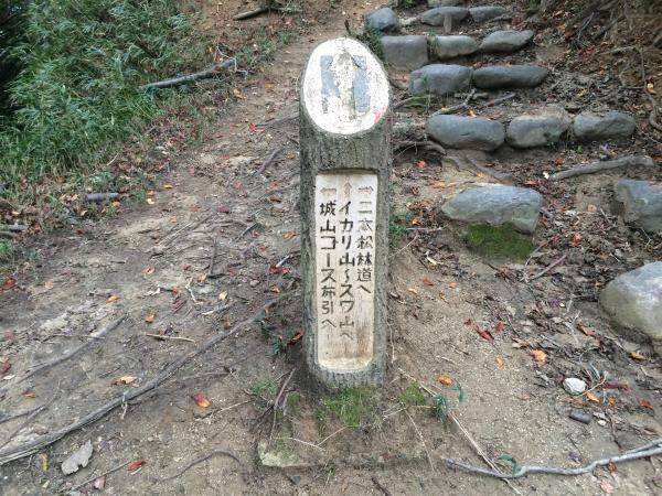歴史を感じながら二本松林道まで歩き紅葉の具合を確認しにきましたが、まだ紅葉には早いようでした。ファミリー登山で歩ける道を探していたのでUターンし5分程来た道を戻り、市章山、イカリ山方面へ。