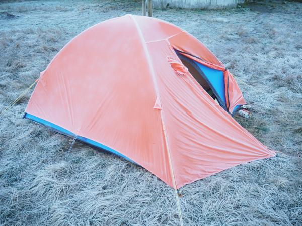 ジッパーを上げるとフライに付着していた薄い氷がパラパラと降っていきた。気温はマイナス7℃。そりゃ草も凍るわな。朝食を済ませ、準備万端でテントから出る。