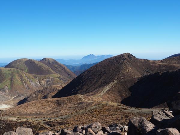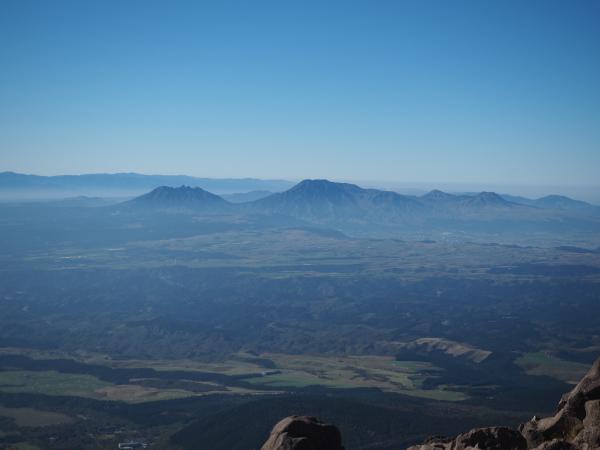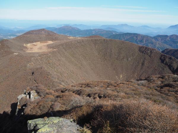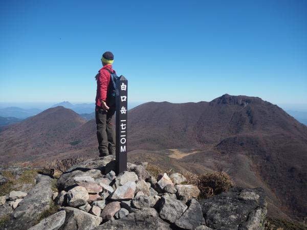 法華院山荘の脇から登り始め、北千里浜を通り、久住分かれに上がる。黄色いペンキ印に従って登っていくと“久住山(1786.5m)”に着く。時間的に急いでいない我々は最初の山頂からまったりこの上ない。理由は天気がいいからだ!イエス!!天気のいい山頂は最高です(前回は吹雪いていて展望ゼロだった…)。阿蘇も由布岳も祖母傾も丸見え。360度の大展望に大満足。誰もいなかった山頂が時間が経つにつれ賑わい始めたのでそろそろ腰をあげようかね。