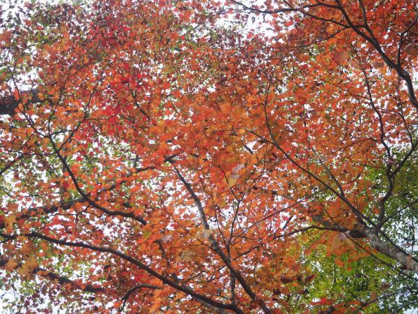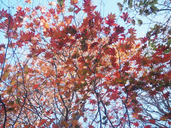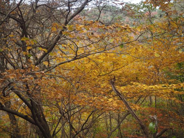 最初は日蔭でちょっと寒いが、登るにつれ体が温まりソフトシェルを脱ぐ。部分的に紅葉は見られるもののほとんどが散っていて登山道がレッドカーペット状態。これはこれで紅葉狩り。