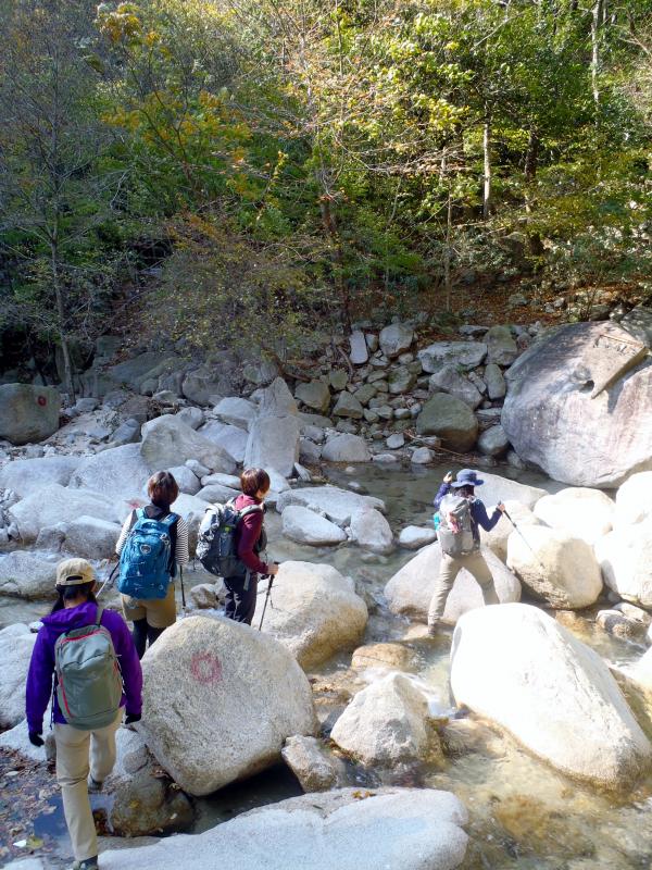 長石谷は沢渡りが連続する沢筋歩きで、スリップや浮き石に注意