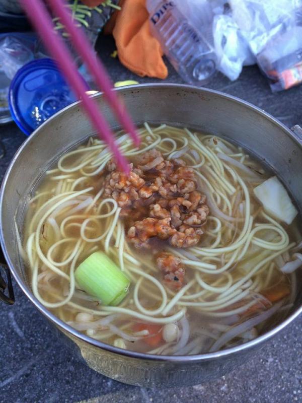 仕込んできた、肉みそ野菜ラーメンと、ミル引き珈琲、スイートポテトをバーナーであぶって
