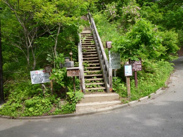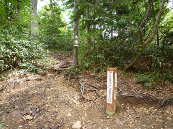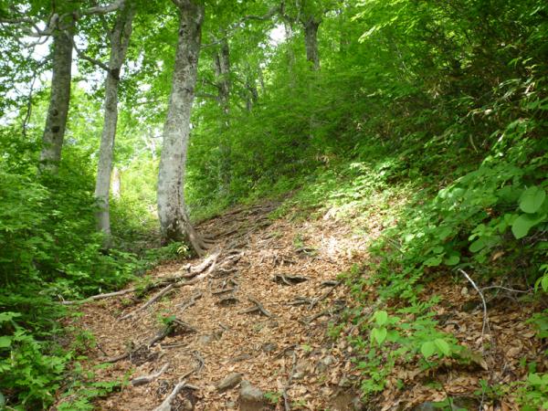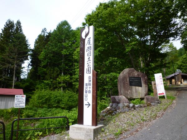 国道から「会津駒ヶ岳登山口」の看板のある林道へ入ります。しばらくは右に沢を眺めながらの林道歩き。すぐに登山道へ。そして再び林道へ出て…。脇に入山届けポストのある階段が実質登山口。この周辺に車を停められます。あとは樹林帯歩き。