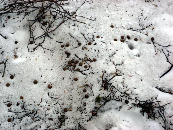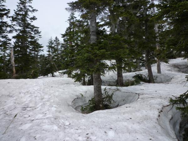 しばらくは雪がかなり着いており、赤布も見つけづらいので迷いがち。特に地図上の「1723.4m」のピークのある尾根に間違って進む人があとを絶たないそうです(駒の小屋のご主人の話)。標高1600m以下になるとほぼ夏道が出ており、歩きやすいです♪キリンテまで下りたら、国道を左へ約200mほどでバス停です。ここから駒ヶ岳登山口までバスで戻り、無事下山と相成ります。バスの本数は一日4~6本です。要ご確認。